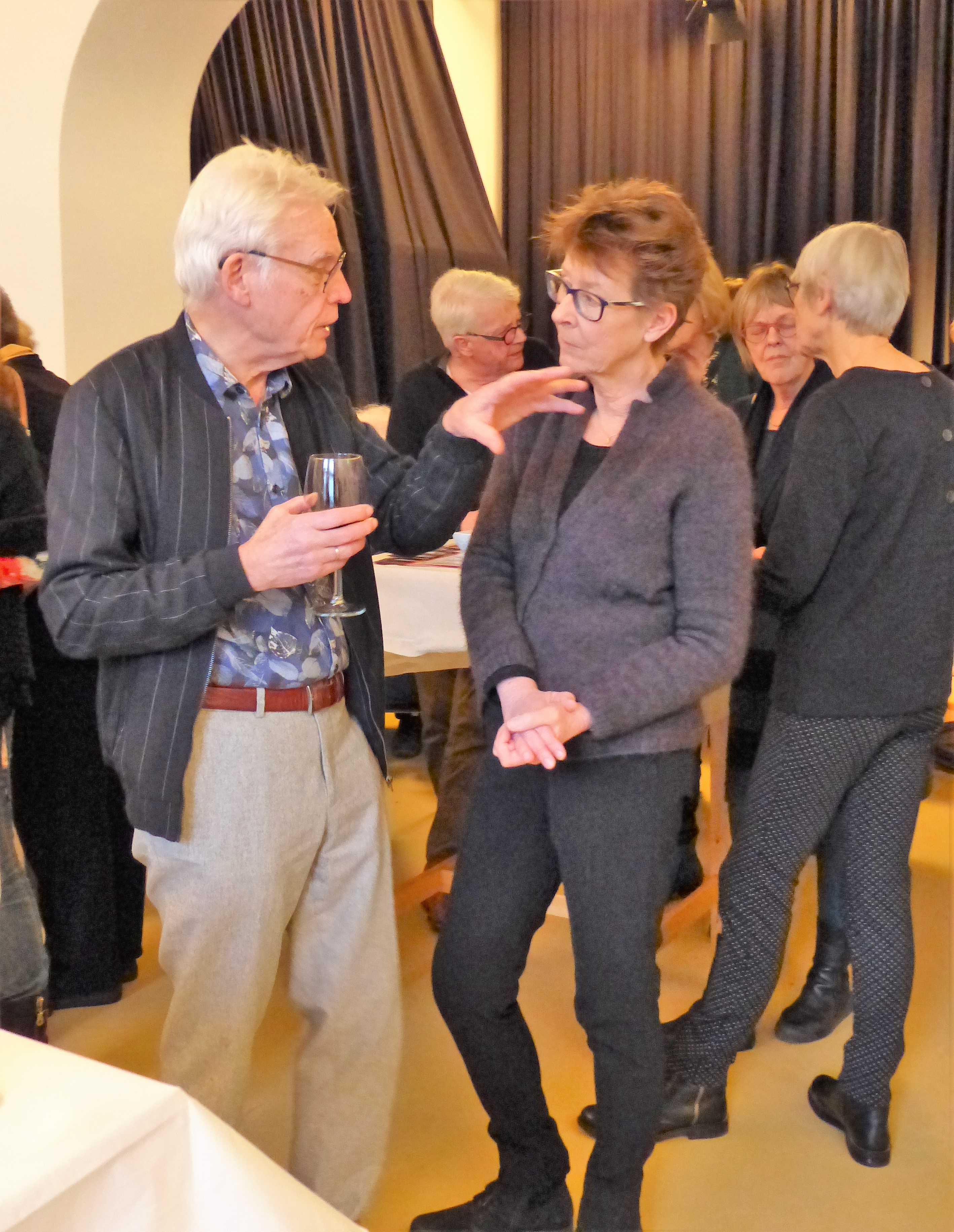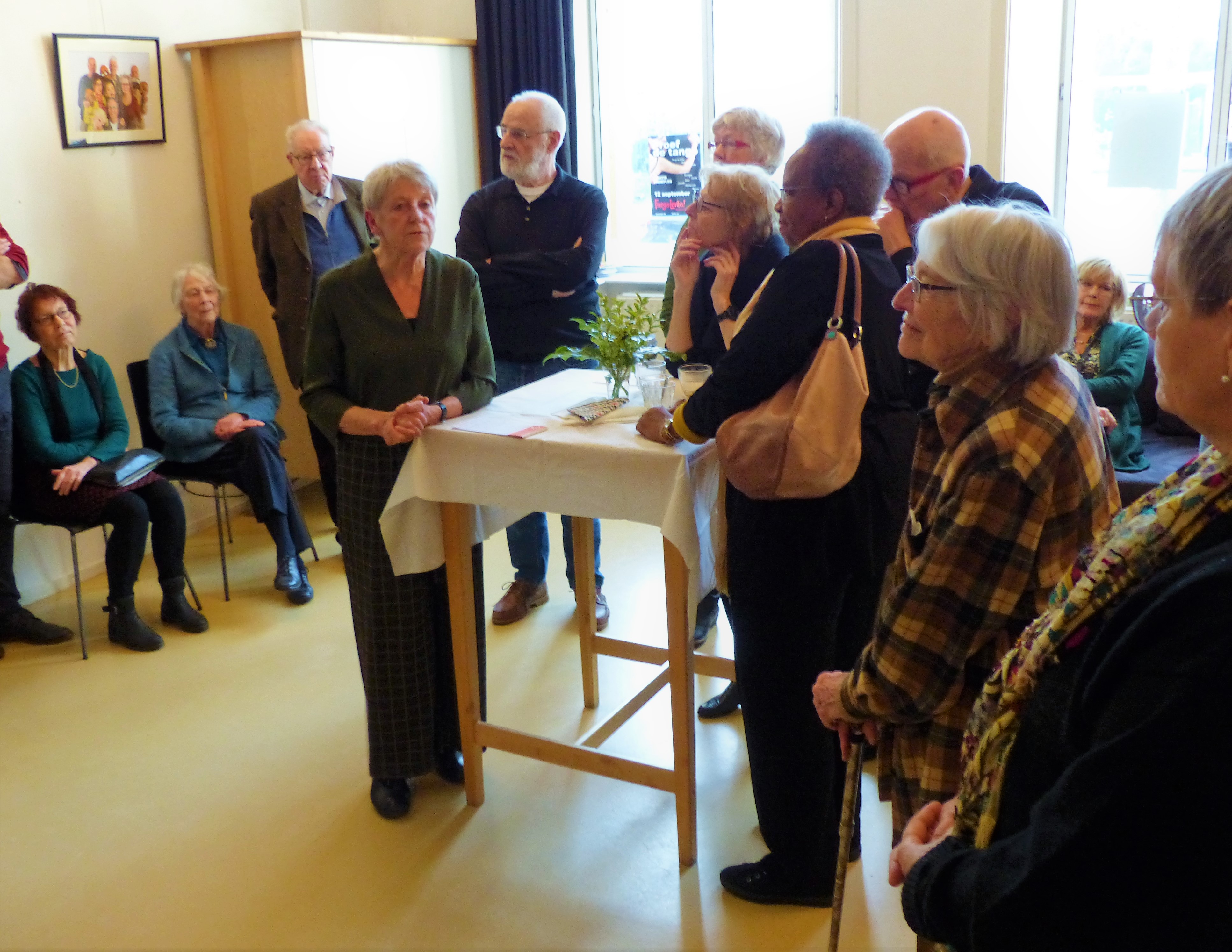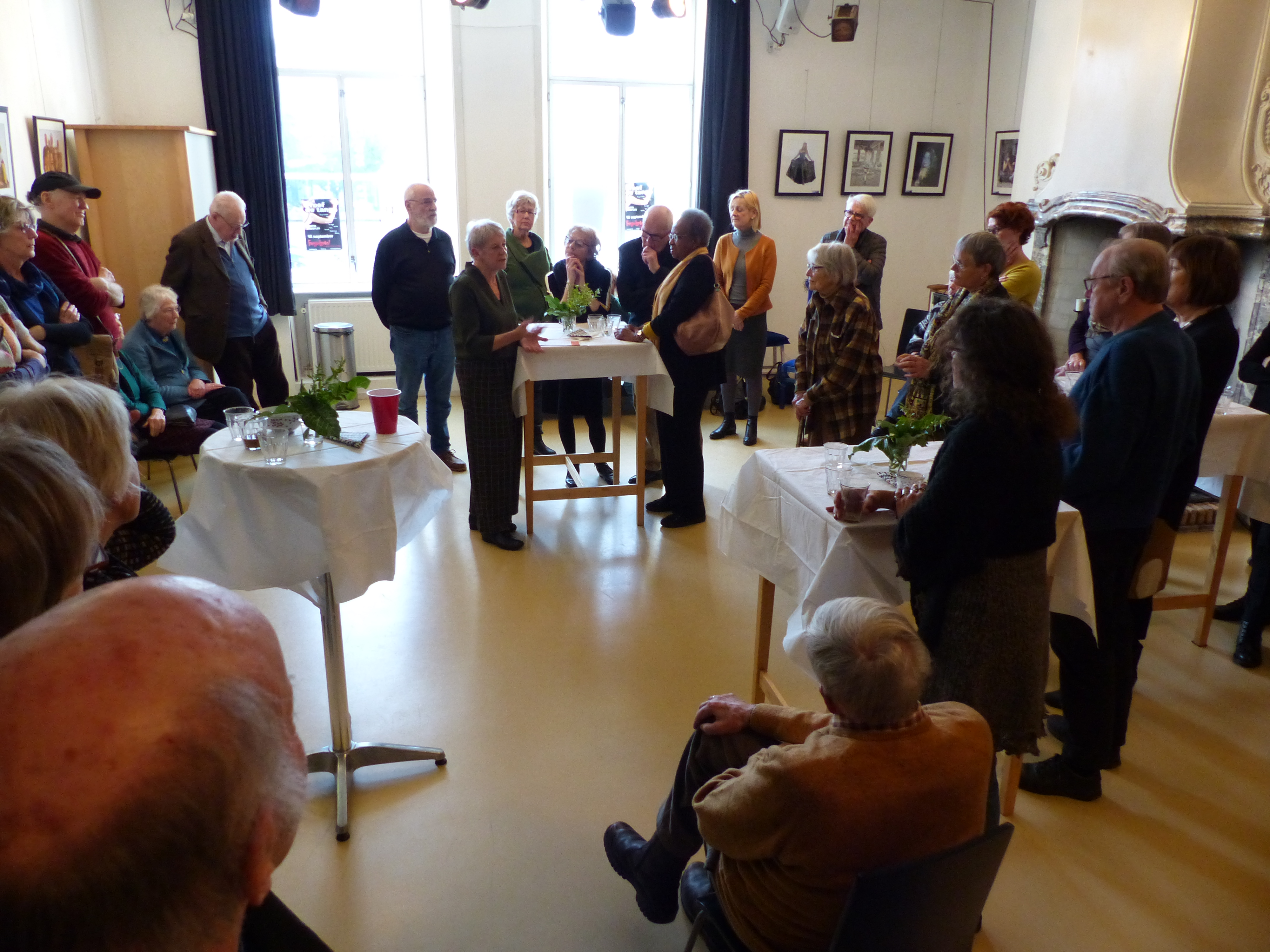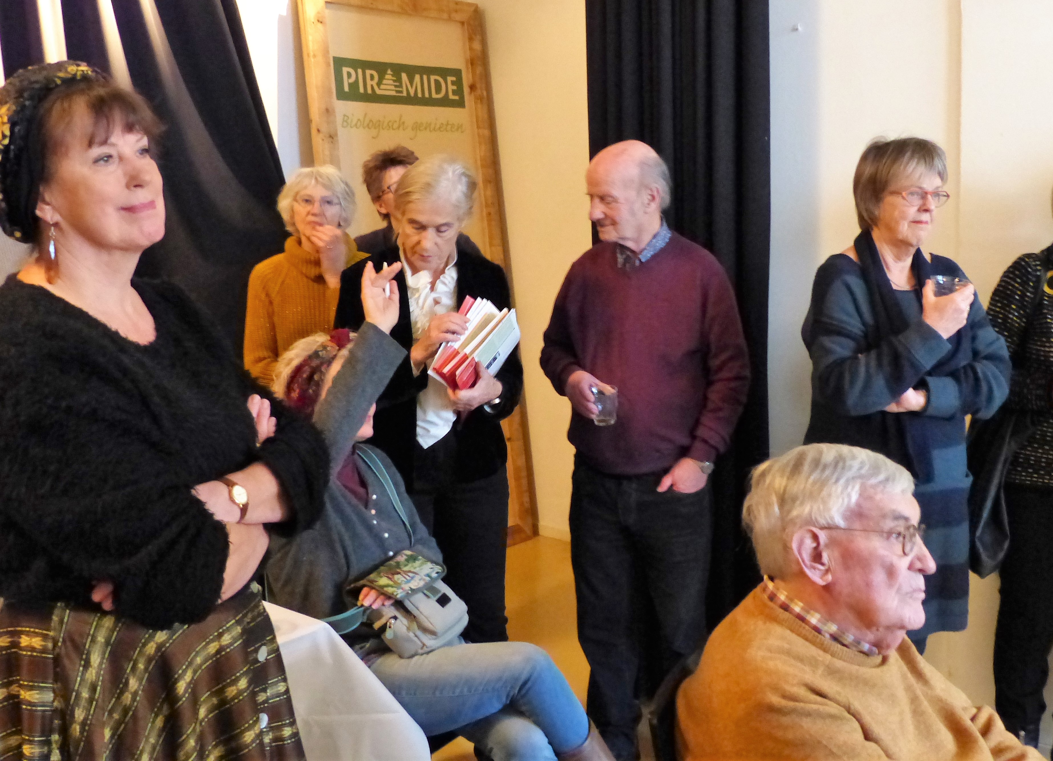 Zij introduceerde de mensen die meegeholpen hadden om hapjes te maken en gaf het advies om op mensen af te stappen die je nog niet kende. Volgens mij is dat advies opgevolgd en ontstond er een heel geanimeerde sfeer. De akoestiek liet wel wat te wensen over, dus dit is iets waar we volgend jaar nog eens extra op kunnen letten.
