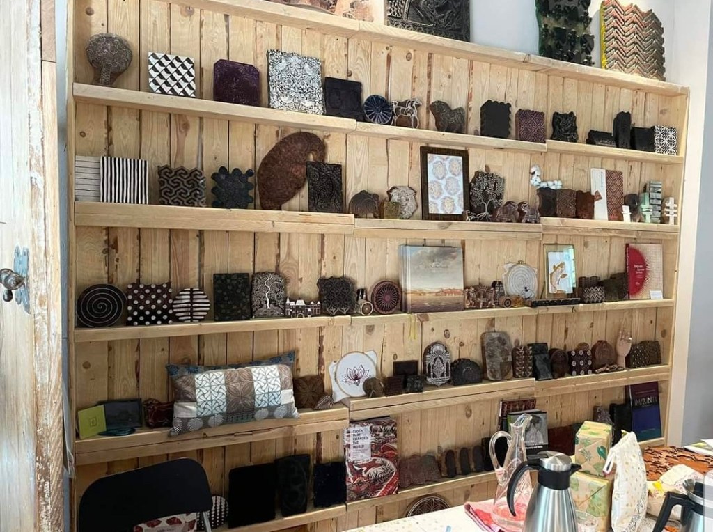 In de werkplaats is een winkel met stoffen, kleding, sjaals en tasjes.